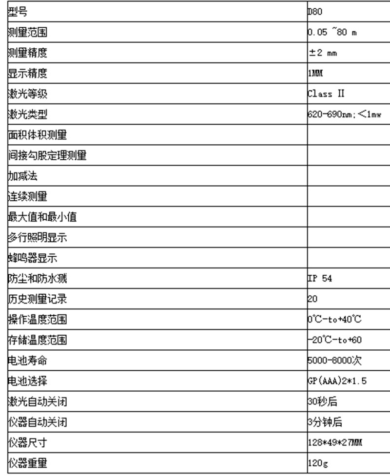 直接距离测量●面积、体积测量●勾股定理测量●连续及最大最小值测量●数据加减运算●定时测量●公制或英制单位切换●数据储存及调用